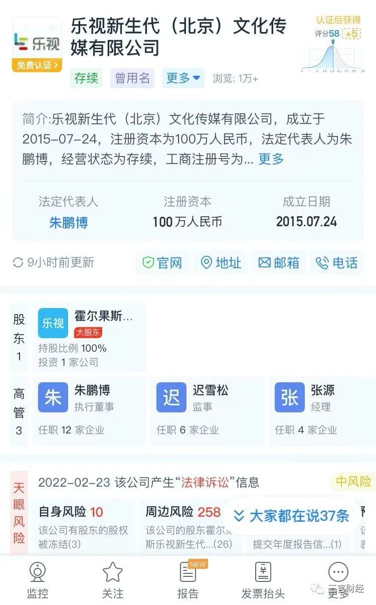天眼查顯示,樂(lè)視新生代(北京)文化傳媒有限公司是霍爾果斯樂(lè)視新生代文化傳媒有限公司的全資子公司。