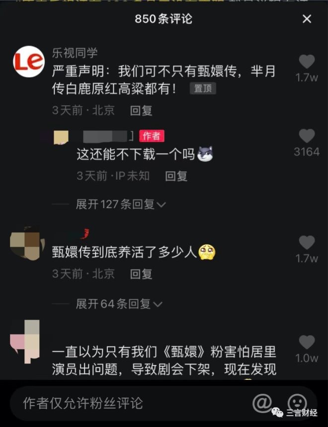 名為 @樂(lè)視同學(xué) 的賬號(hào)非;钴S地在這類視頻評(píng)論區(qū)回復(fù):“我們可不只有甄嬛傳,羋月傳白鹿原紅高粱都有!”、“是誰(shuí)說(shuō)我們沒(méi)有老板”。