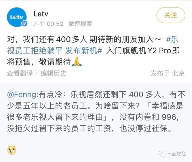 7月11日,樂(lè)視的官方微博賬號(hào) @Letv 轉(zhuǎn)發(fā)了這條微博,并且回復(fù)稱,“對(duì),我們還有400人”,并配上了“樂(lè)視員工拒絕躺平 發(fā)布新機(jī)”的話題為新發(fā)布的手機(jī)做宣傳。