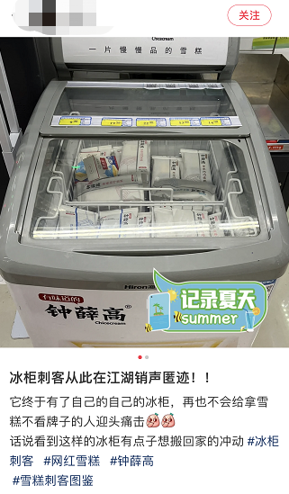 從6月中旬左右開始,就有用戶在小紅書曬出了帶有鐘薛高LOGO以及圖片的“單獨冰柜”,“逛超市無意間發(fā)現(xiàn)的,再也不會給拿雪糕不看牌子的人迎頭痛擊”。