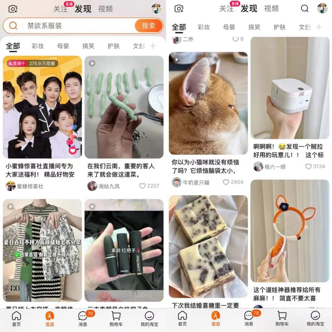 打開(kāi)淘寶,你會(huì)看到位于下方一級(jí)入口的逛逛場(chǎng)景,供用戶發(fā)布消費(fèi)體驗(yàn)的圖文視頻內(nèi)容。