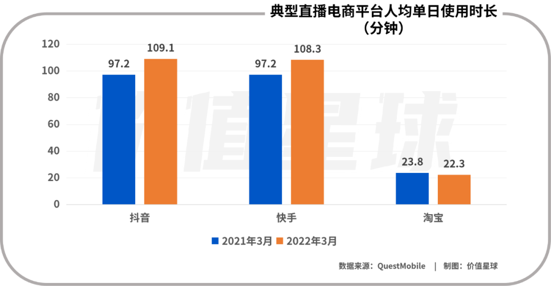 并且,抖音與快手憑借其對(duì)用戶碎片化時(shí)間的占領(lǐng),2022年3月兩者的人均單日使用時(shí)長(zhǎng)接近110分鐘,而同期淘寶的人均單日使用時(shí)長(zhǎng)僅為22分鐘。