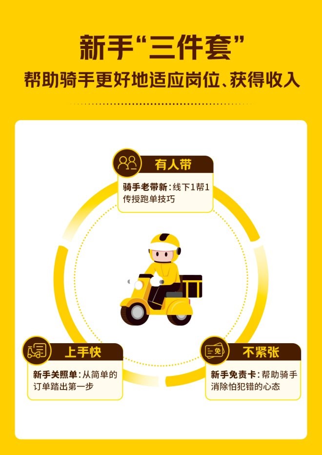為了幫助新騎手循序漸進地提升配送技能,更好地獲得收入,7月14日,美團配送推出新手“三件套”,包括一對一傳幫帶的“騎手老帶新”,優(yōu)先分配難度較低的“新手關(guān)照單”,以及提供額外免責(zé)機會的“新手免責(zé)卡”。