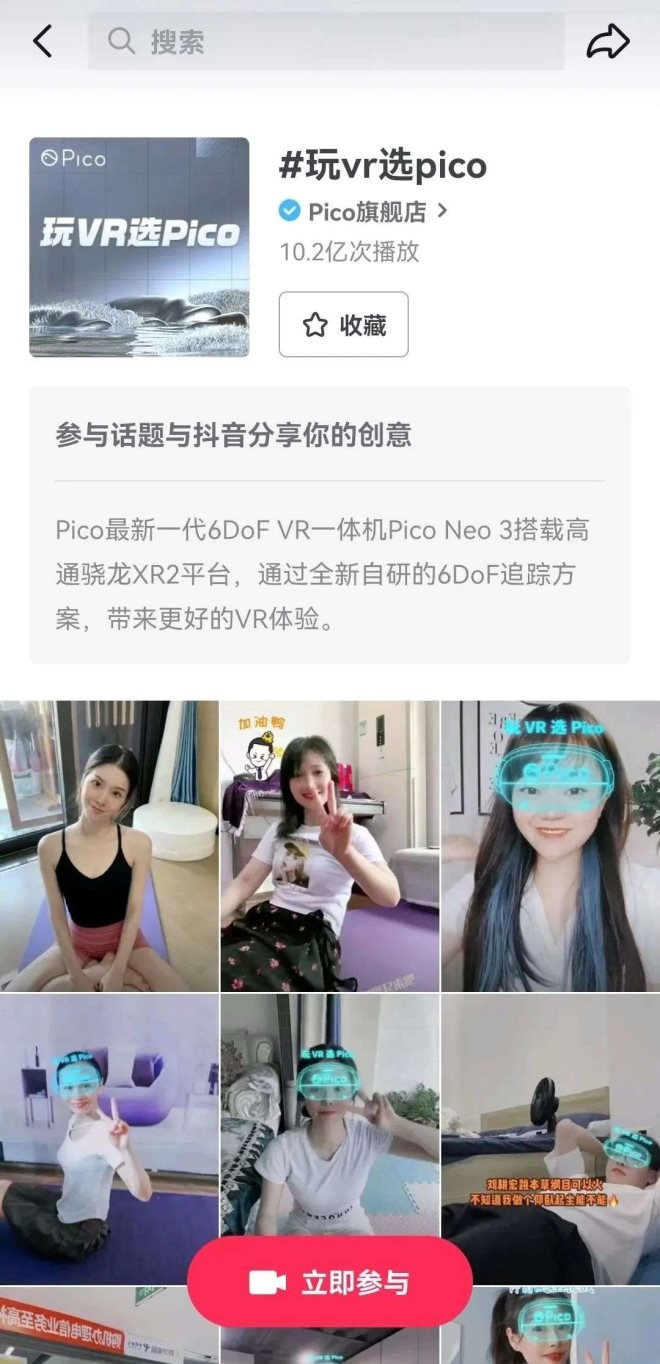 目前,抖音#玩VR選Pico話題已經(jīng)達到了10.2億的播放量。