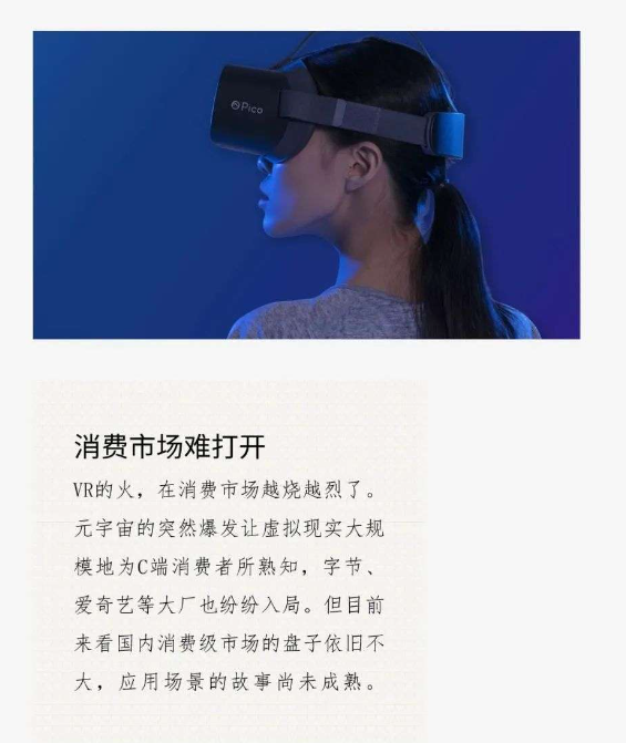 因此雖然字節(jié)、愛奇藝等大廠都已經(jīng)紛紛布局消費級VR,但目前來看依舊有些“螺螄殼里做道場”的意味,如何最大化打開這個新市場,對入局者來說困難重重。