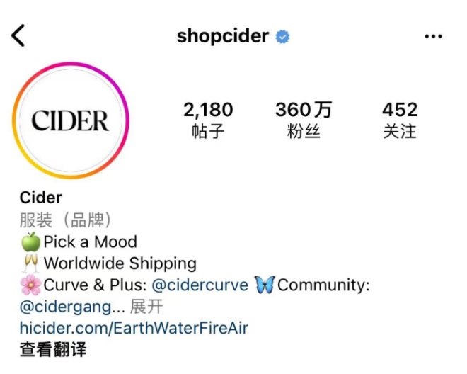 2020年成立的Cider,模式與Shein相仿,憑借著“物美價廉”的特點,深深抓住了年輕女孩子的喜好。成立一年已獲4輪融資,目前僅在Instagram,粉絲已經有360萬。