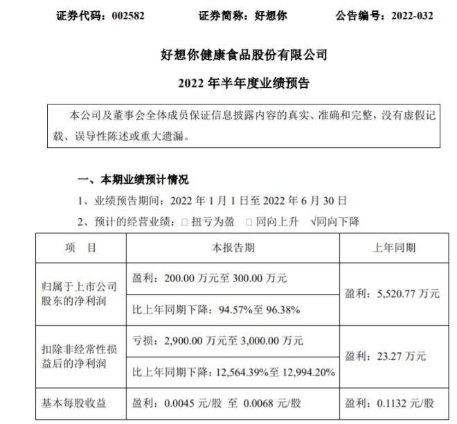 好想你預(yù)計(jì)上半年凈利同比暴跌94.57%-96.38%