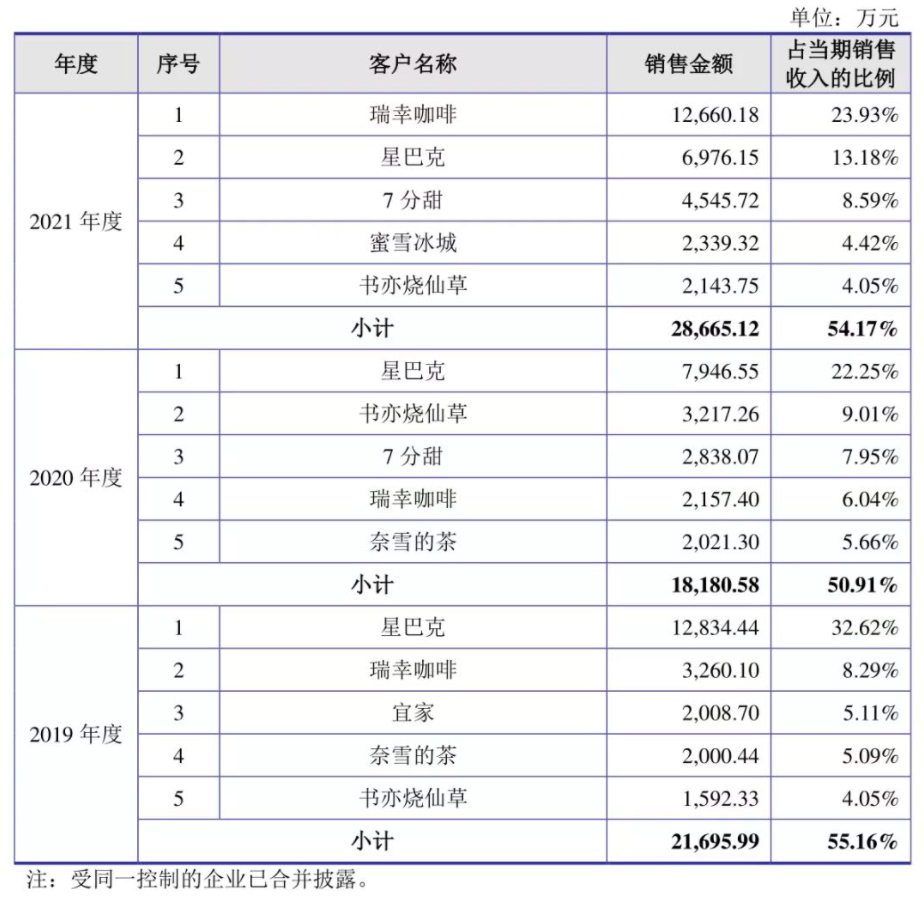 大客戶在德馨食品的收入中影響很大——前五大客戶合計占當(dāng)期銷售收入的一半比重。前幾大重要客戶維持在星巴克、瑞幸咖啡、宜家、奈雪的茶、書亦燒仙草、7分甜、蜜雪冰城、宜家。