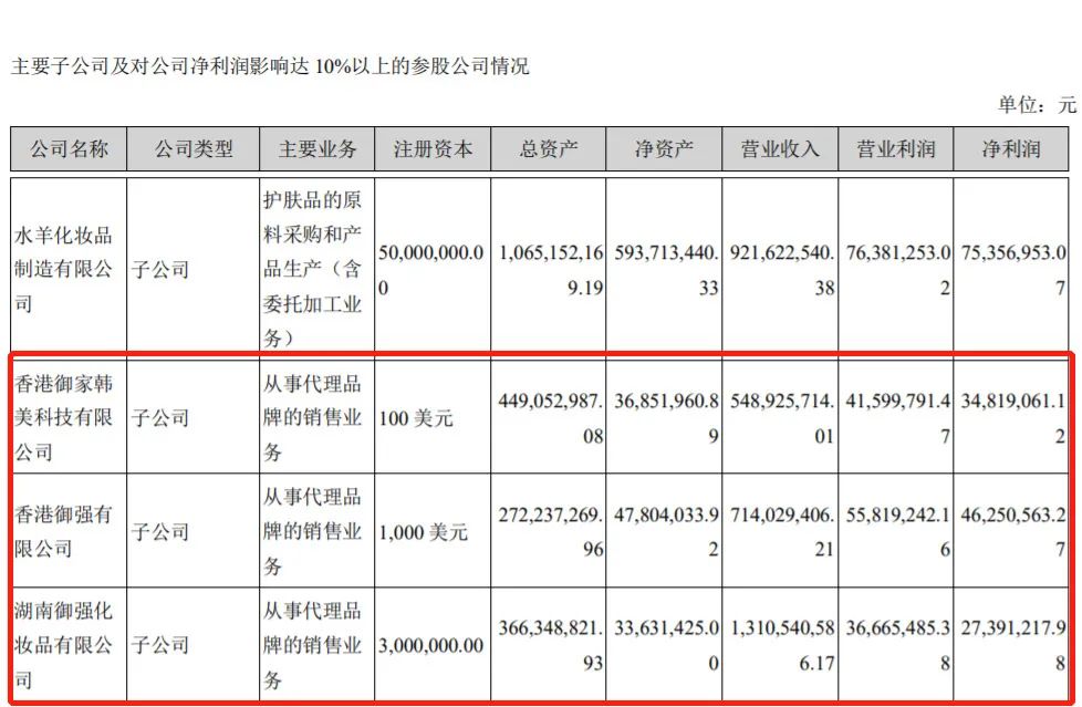 根據(jù)水羊股份2021年年報顯示,水羊化妝品制造有限公司、香港御家韓美科技有限公司、香港御強有限公司、湖南御強化妝品有限公司等4家子公司,對公司凈利潤的影響達10%以上。