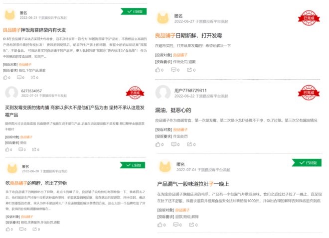 以公司所言的高品質(zhì)產(chǎn)品為例,據(jù)創(chuàng)始人楊紅春在與投資者交流中表示,截至2022年公司已擁有超過1500款產(chǎn)品,產(chǎn)品全部采用定制化與非定制化代工廠采購(gòu)的模式。雖然公司聲稱制定了嚴(yán)苛的產(chǎn)品質(zhì)量標(biāo)準(zhǔn)書,建立了自己的產(chǎn)品檢測(cè)中心,通過了國(guó)家級(jí)實(shí)驗(yàn)室(CNAS)認(rèn)證,覆蓋產(chǎn)品入庫(kù)到上市銷售后的全部環(huán)節(jié)。但是,如果細(xì)看用戶體驗(yàn),顯然良品鋪?zhàn)舆需要做得更多,在黑貓投訴當(dāng)中,良品鋪?zhàn)右还彩盏搅?532條投訴,其中,食品過期、漏油、發(fā)霉等問題屢見不鮮。而且翻看投訴,其中很高比例發(fā)生時(shí)間為2022年。