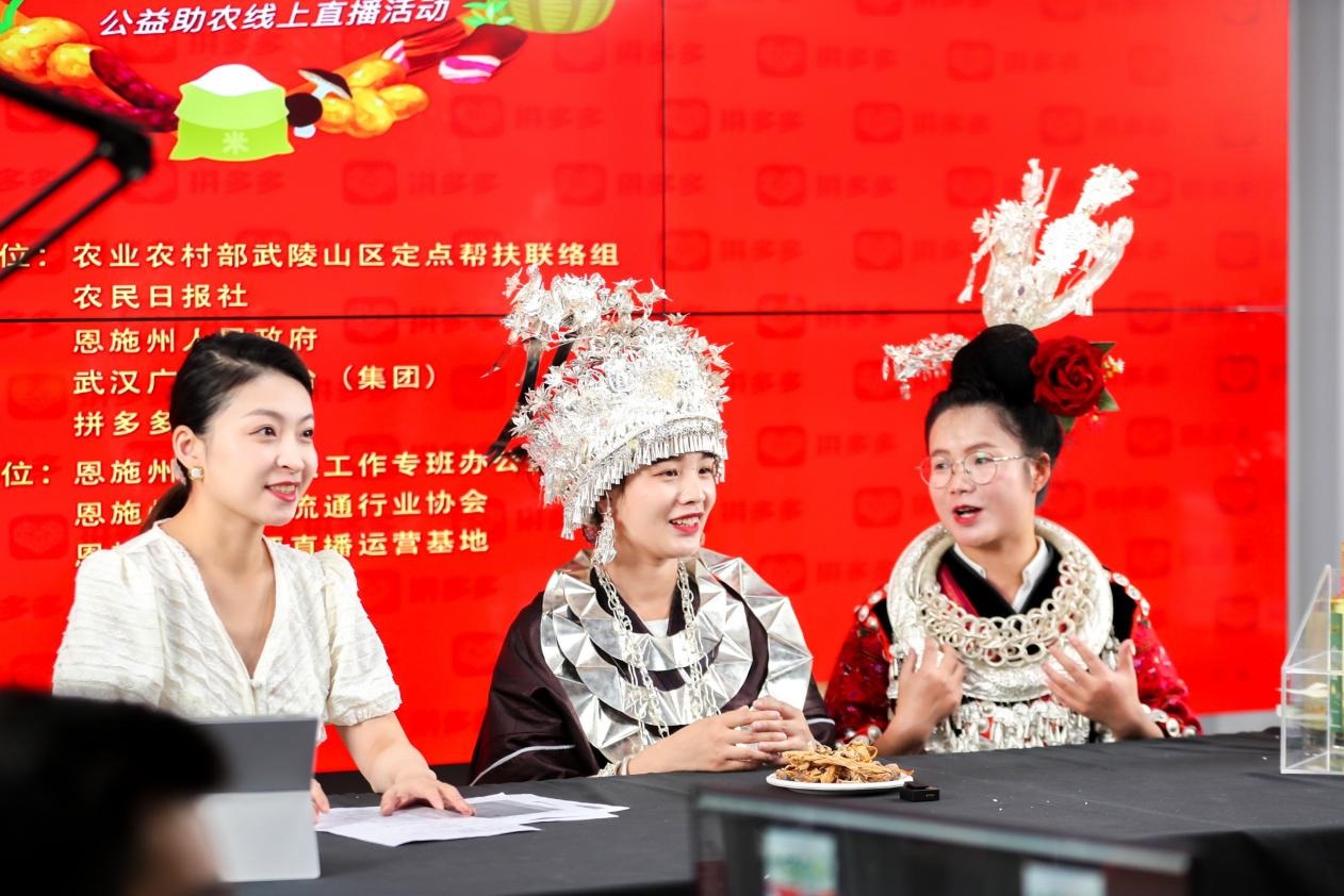 7月15日,農(nóng)業(yè)農(nóng)村部武陵山區(qū)定點幫扶聯(lián)絡組、農(nóng)民日報社、恩施州政府、拼多多聯(lián)合在湖北省恩施市直播運營基地舉辦了一場“尋鮮恩施 武陵優(yōu)品”公益助農(nóng)直播活動,11位武陵山區(qū)縣市領(lǐng)導出鏡推介當?shù)厣剿幕Y源以及48款當?shù)剞r(nóng)特產(chǎn)品尖貨,引來150萬全國網(wǎng)友關(guān)注選購。