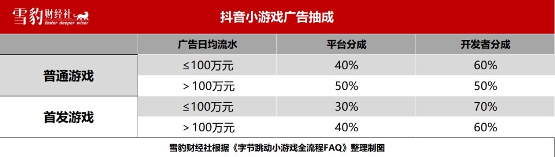 抖音小游戲的廣告抽成一向不低。據(jù)平臺(tái)發(fā)布的《字節(jié)跳動(dòng)小游戲全流程FAQ》,抖音對(duì)小游戲的廣告抽成比例為三到五成,對(duì)于微信小游戲這樣的非首發(fā)游戲,平臺(tái)抽成比例為40%~50%。