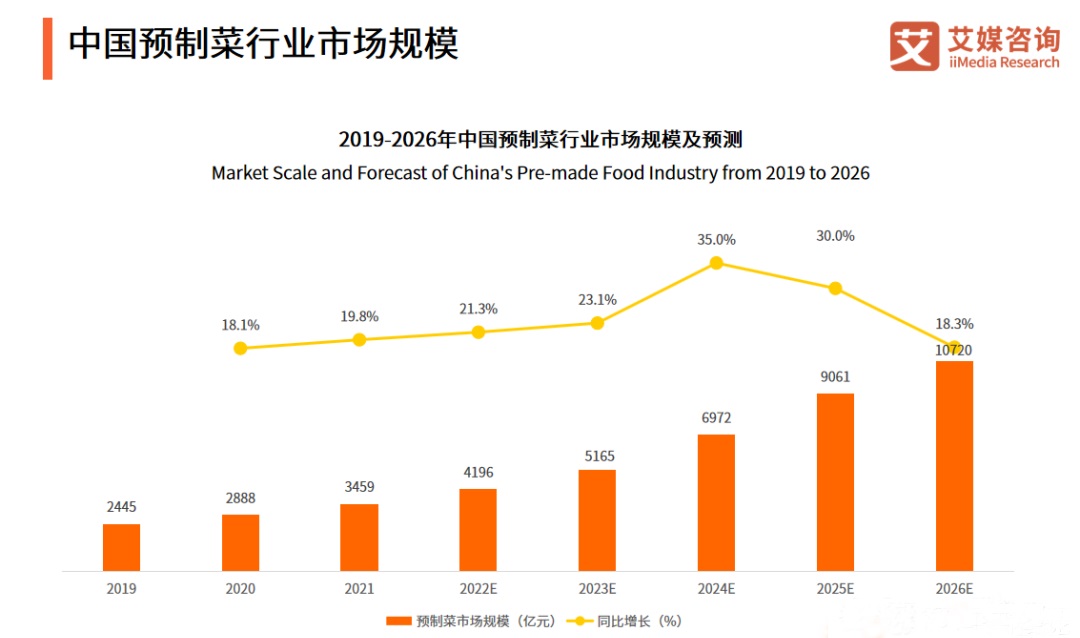 根據(jù)艾媒咨詢顯示,2019年中國預(yù)制菜市場規(guī)模約2445億元,2021年中國預(yù)制菜行業(yè)規(guī)模為3459億元,預(yù)計(jì)2026年達(dá)10720億。