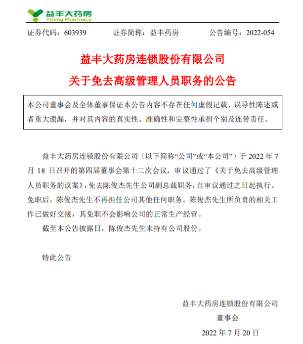 據(jù)悉,陳俊杰未持有益豐藥房股份。對于免職原因,公告中也未提及。