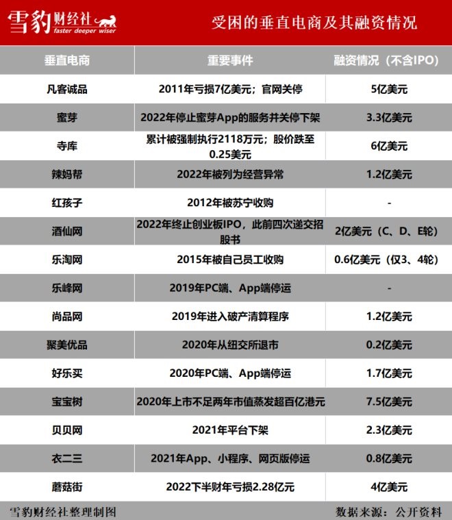 雪豹財經(jīng)社根據(jù)公開資料不完全統(tǒng)計,過去12年間,15家知名垂直電商的總?cè)谫Y額至少達(dá)到35億美元,約合人民幣230億元。