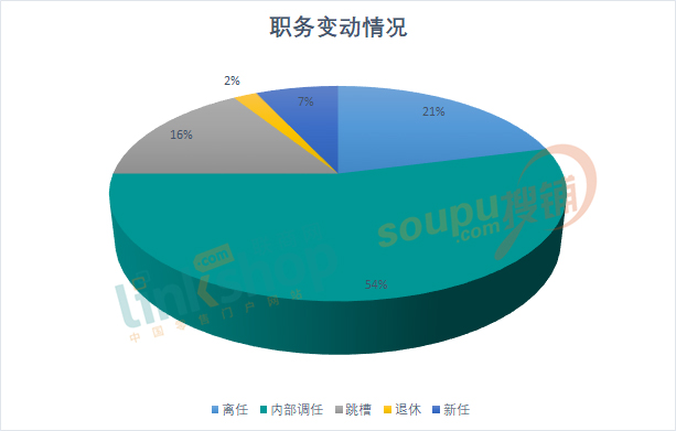 從變動性質(zhì)上看,內(nèi)部調(diào)任人數(shù)最多至62位,占比達(dá)54%;離任人數(shù)至24位,占比達(dá)21%;跳槽人數(shù)至18位,占比達(dá)16%;新任人數(shù)至8位,占比達(dá)7%;退休人數(shù)至3位,占比達(dá)2%。這與往年的基本情況一致。