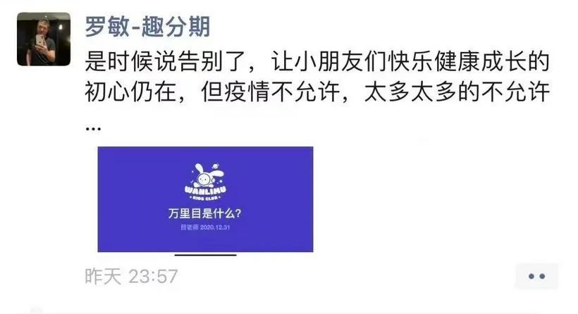 結(jié)果到了2022年3月,羅敏在朋友圈發(fā)布萬里目少兒項(xiàng)目的告別。