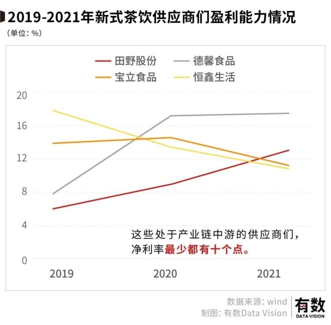 這樣的情況并非孤例,新式茶飲的供應(yīng)商們最近接連上市,而與奶茶品牌不賺錢(qián)形成對(duì)比的是,這些處于產(chǎn)業(yè)鏈中游的供應(yīng)商們,凈利率最少都有十個(gè)點(diǎn)。