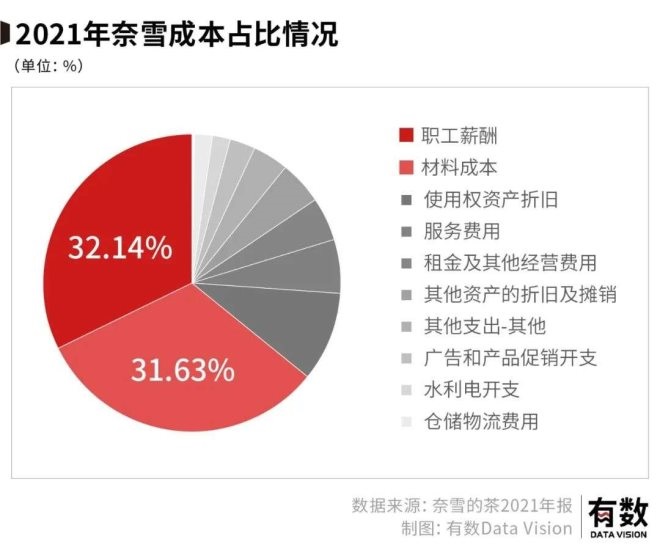 根據(jù)奈雪的茶財(cái)報(bào)顯示,2018至2021年成本占比最大的為材料成本和人工成本,合計(jì)占比超50%,而主陣地在一二線(xiàn)城市、主打高端的茶飲門(mén)店同時(shí)又不得不面對(duì)逐年上漲的房租壓力。