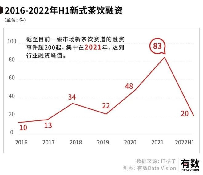 下游新茶飲行業(yè)進(jìn)入門(mén)檻較低,且受資本青睞,新進(jìn)入玩家數(shù)量眾多。根據(jù)IT桔子數(shù)據(jù),截至目前一級(jí)市場(chǎng)新茶飲賽道的融資事件超200起,集中在2021年,達(dá)到行業(yè)融資峰值。