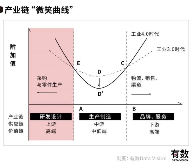 我們一般看產(chǎn)業(yè)鏈價(jià)值分布,是呈 “微笑”曲線(xiàn),前后兩端朝上,而產(chǎn)業(yè)鏈的中間部分較低。因附加值更多體現(xiàn)在上下游,一般屬于產(chǎn)業(yè)鏈的研發(fā)和銷(xiāo)售端,而處于中間環(huán)節(jié)的制造,附加值最低。