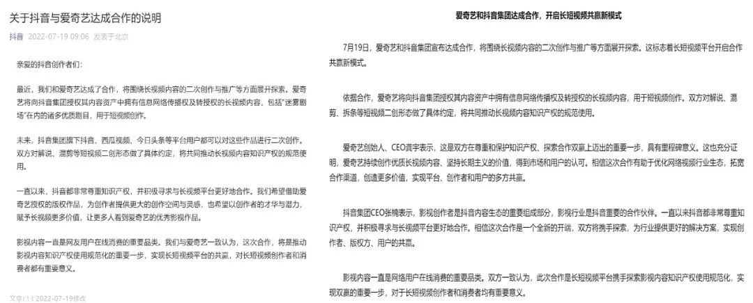 7月19日,抖音與愛奇藝同時(shí)宣布,雙方達(dá)成了一項(xiàng)合作協(xié)議。