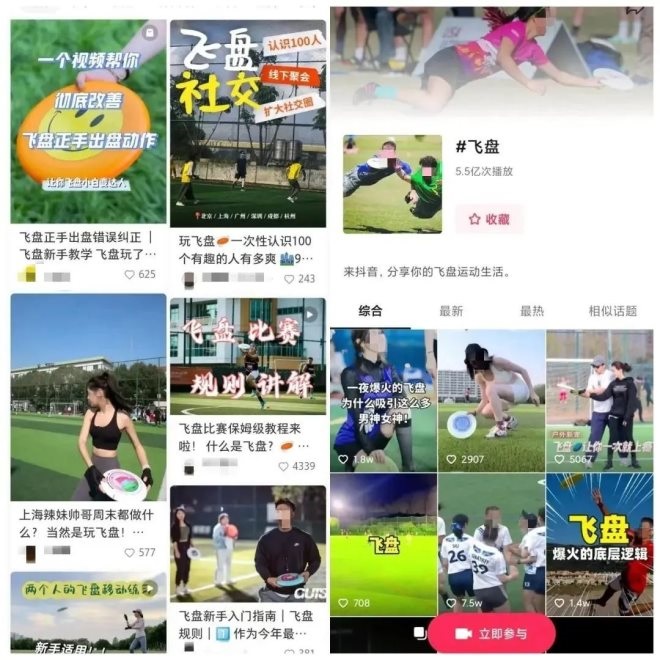 圖/小紅書飛盤相關(guān)筆記、抖音飛盤話題頁(左、右)