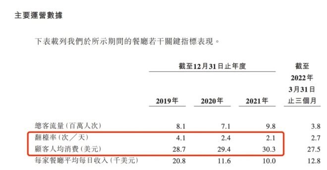 但受到疫情影響,2019—2021年,特海國際門店整體翻臺率分別為4.1次/天、2.4次/天與2.1次/天,下滑明顯。