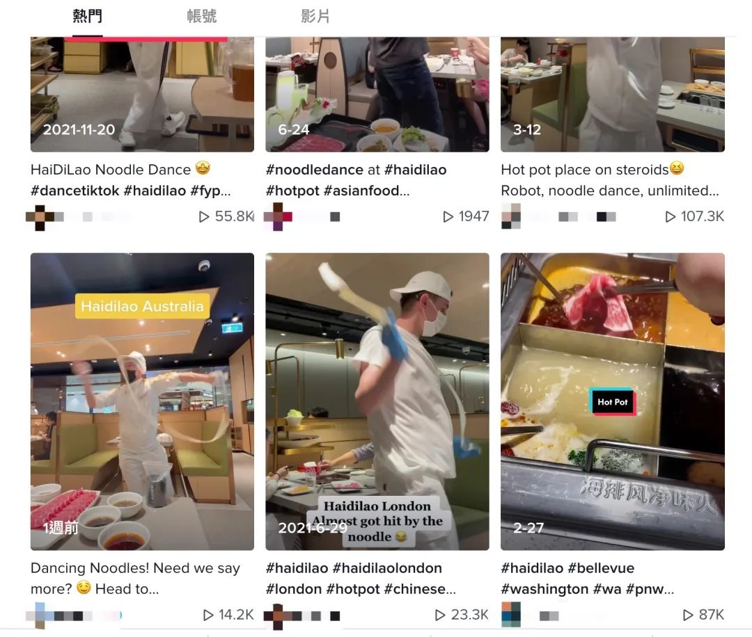 結(jié)合消費(fèi)者反饋與海外社交媒體上廣泛傳播的視頻,海底撈的特色服務(wù),在海外同樣是流量密碼。在Tik Tok上,以HAIDILAO為關(guān)鍵詞搜索,結(jié)果中,以noodle dance、free toy(免費(fèi)玩具)、nail salon(美甲沙龍)為關(guān)鍵詞的內(nèi)容比比皆是,其中,許多視頻播放量都超過10萬。