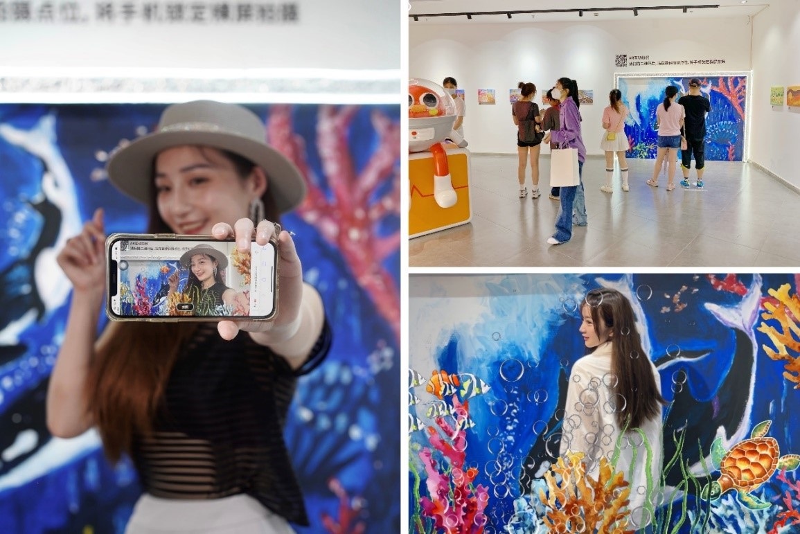 來(lái)到凱德虹口一樓的Bridge+ Spark空間內(nèi)的展區(qū),整體布置的未來(lái)感十足,以銀色為主色系的畫(huà)展主場(chǎng)充滿前衛(wèi)科技氛圍。展區(qū)入口處的拍照區(qū)吸引了眾多參觀者打卡拍照,在巨大的鯨魚(yú)畫(huà)作前,舉起手機(jī),居然出現(xiàn)了游動(dòng)的魚(yú)群和海歸,還有隨波飄蕩的海草,讓人仿佛置身于海底世界。