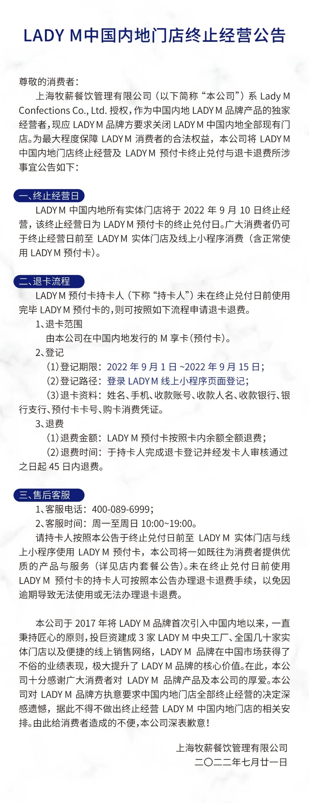 同時,LADY M中國內(nèi)地所有實體門店將于2022年9月10日終止經(jīng)營,該終止經(jīng)營日為LADY M預(yù)付卡的終止兌付日。消費者仍可于終止經(jīng)營日前至LADY M實體門店及線上小程序消費(含正常使用LADY M預(yù)付卡)。