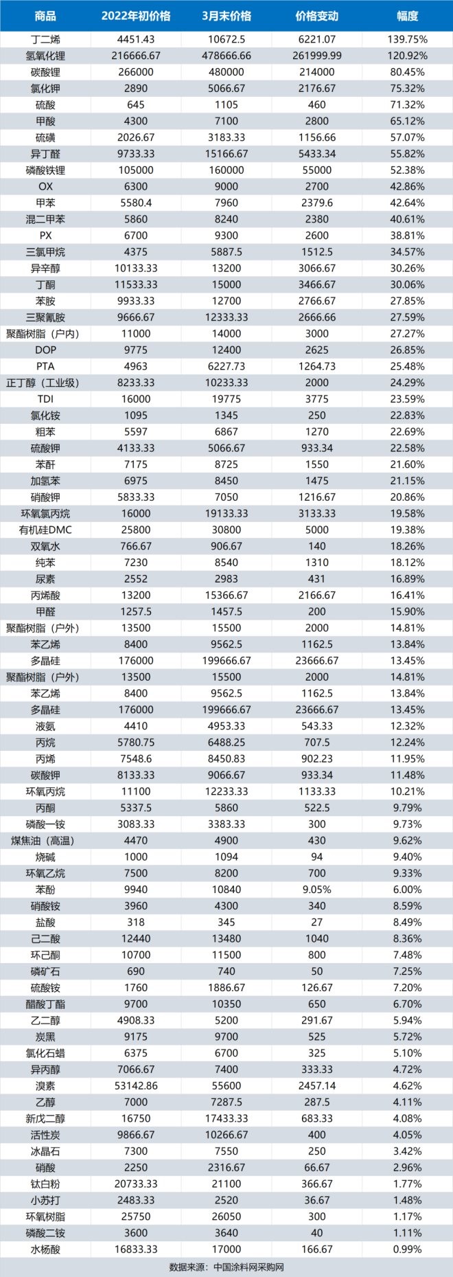 根據(jù)中國涂料網(wǎng)采購網(wǎng)數(shù)據(jù),2022年二季度以來,科慕、龍佰、畢克等國內(nèi)外化工巨頭掀起新一輪原料漲價(jià)潮,包含鈦白粉、多元醇、異丁醛等60多種化工原料紛紛漲價(jià)。
