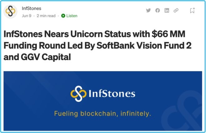 一個月前,Web3基礎(chǔ)設(shè)施提供商InfStones宣布獲得新一輪6600萬美元融資,由軟銀愿景基金二期、GGV紀(jì)源資本領(lǐng)投。截至目前,這家公司總?cè)谫Y額超1億美元。