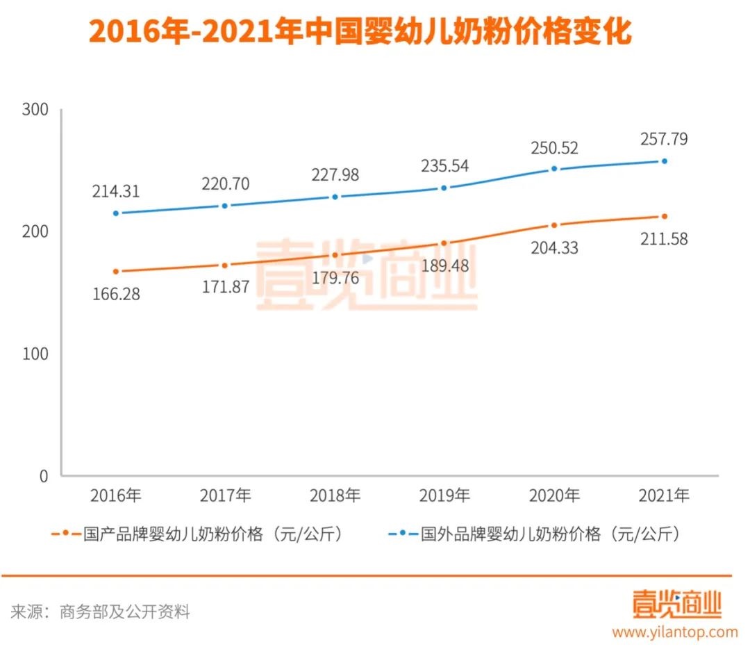 但新生兒用戶的下降,意味著想保持市場規(guī)模,奶粉單價(jià)需要提高。2021年,國產(chǎn)品牌嬰幼兒奶粉的價(jià)格已經(jīng)來到了211.58元/公斤。