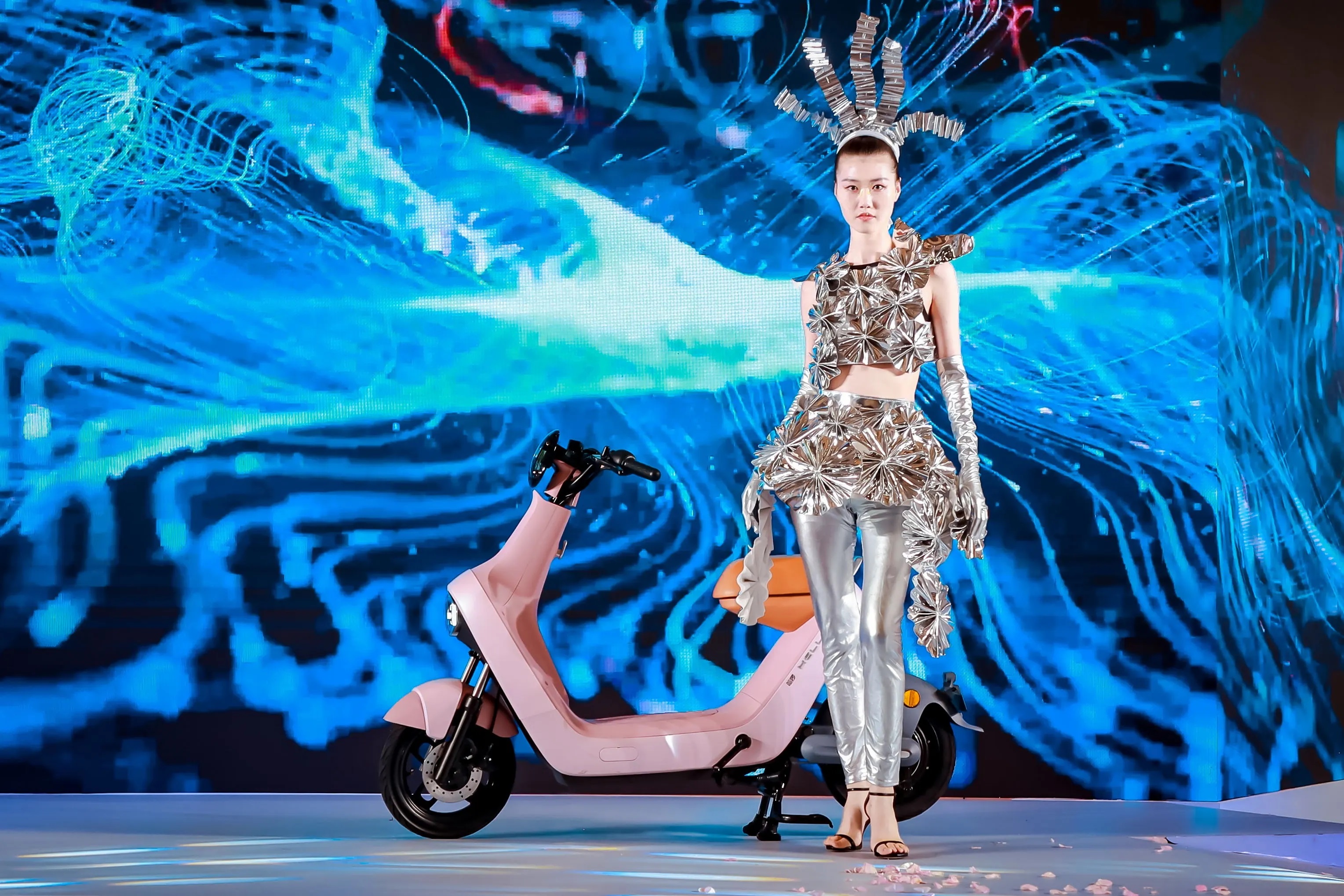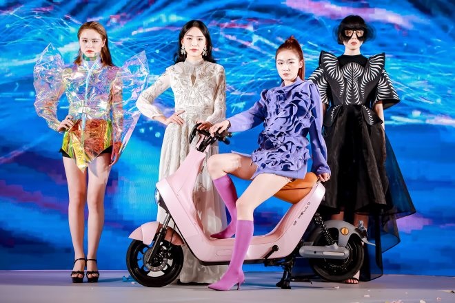 12位超模輪番上臺走秀,均與哈啰B70 pro電動車同框凹造型,各式時裝都能與哈啰電動車神奇組合,帶來了一場驚艷的視覺盛宴。