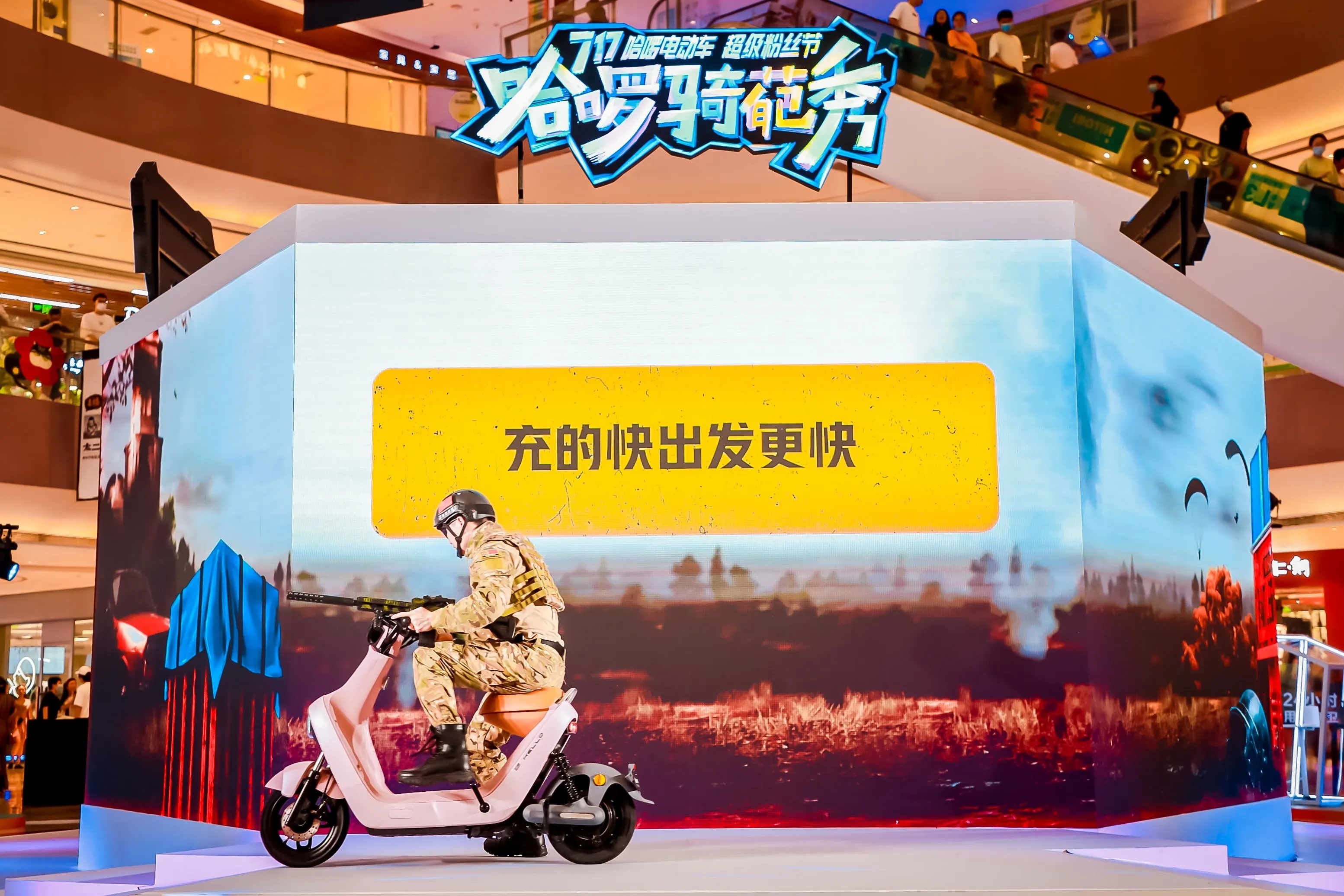 DJ暖場后,一場獨特的Cosplay騎葩秀依次上演。最先上場的演員模擬吃雞游戲里的角色,主要演繹的是哈啰電動車的“智能快充”功能,2小時內(nèi)快充完成,選手可以快速完成任務(wù)。