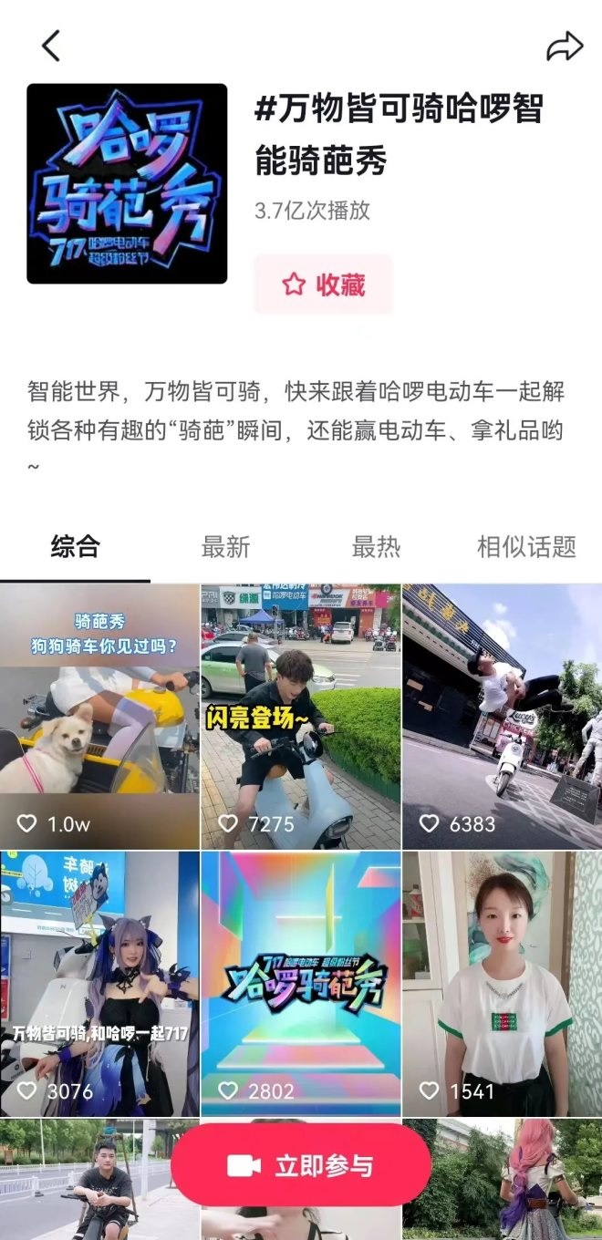 據(jù)了解,除了線下的“騎葩大秀”活動,哈啰在線上也打造了抖音挑戰(zhàn)賽活動。“717哈啰騎葩秀”開幕前,哈啰于14日即在抖音平臺發(fā)起一場#萬物皆可騎哈啰智能騎葩秀#的活動,參與者只需自由創(chuàng)意各種花式騎行視頻,即有機(jī)會獲得相應(yīng)獎勵,包含哈啰電動車、騎行大禮包等等;顒右唤(jīng)上線就激發(fā)網(wǎng)友參與熱情,截至17日話題播放量已超3.7億次。