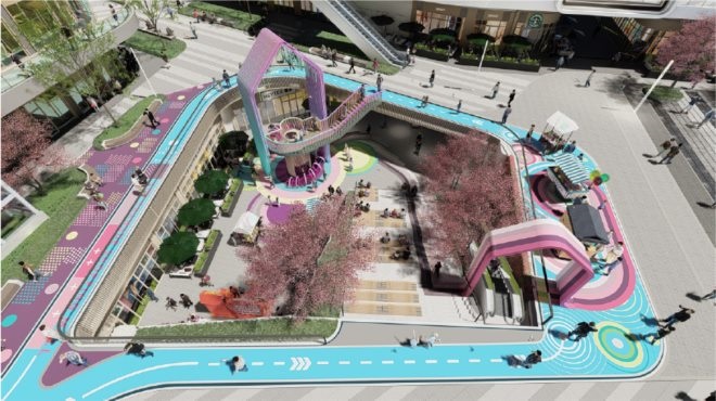 下沉式廣場“溯光森谷”擁有活力跑道和12.8m高兒童滑梯裝置“漁人小屋”,集游樂、全民健身、親子遛娃、假日休閑于一體。