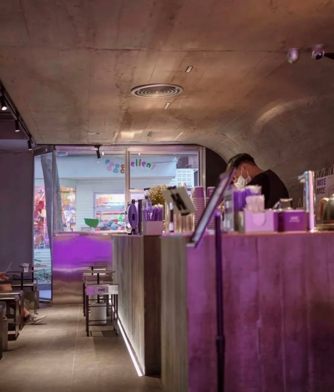 廣州首店的整體裝修風(fēng)格仍然延續(xù)了 紫色調(diào)與“廢墟風(fēng)”的一貫風(fēng)格。整家店的內(nèi)部裝修多采用水泥灰色,同時(shí)通過(guò)紫色的燈光為店內(nèi)營(yíng)造出一種神秘氣息。