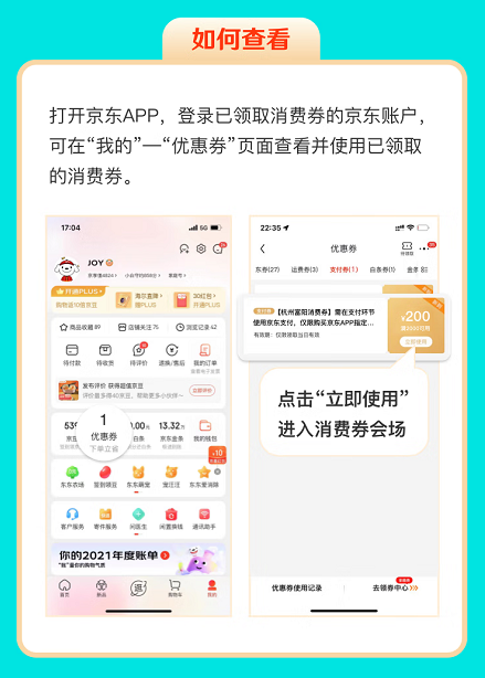 打開京東APP,登錄已領(lǐng)取消費券的京東賬戶可在“我的”-“優(yōu)惠券”頁面查看并使用已領(lǐng)取的消費券。