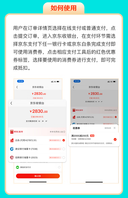 用戶在訂單詳情頁選擇在線支付或普通支付,點擊提交訂單,進入京東收銀臺,在支付環(huán)節(jié)需選擇京東支付下任一銀行卡或京東白條完成支付即可使用消費券,點擊相應(yīng)支付工具后的紅色優(yōu)惠券標(biāo)簽,選擇要使用的消費券進行支付,即可完成抵扣。