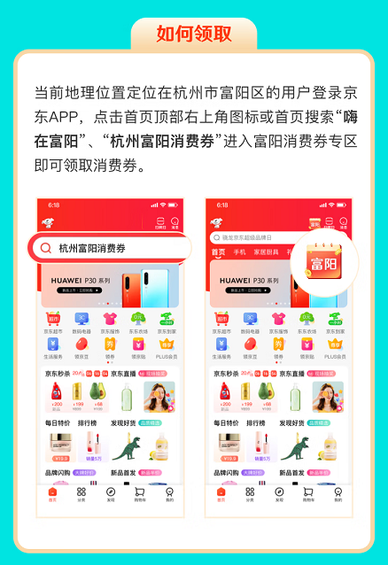 當(dāng)前地理位置定位在杭州市富陽區(qū)的用戶登錄京東APP,點擊首頁頂部右上角圖標(biāo)或首頁搜索“嗨在富陽”“杭州富陽消費券”進入富陽消費券專區(qū)即可領(lǐng)取消費券。