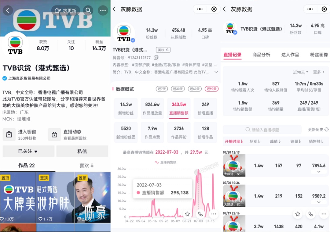 1997年,香港回歸之時,《天龍八部》甚至造就了六家衛(wèi)視同時播放的盛況。今年是香港回歸25周年,同時也是TVB誕生的55周年。這家老牌公司,最近在抖音上悄悄開出一個賬號:“TVB識貨(港式甄選)”,這個和“東方甄選”名字十分相似的賬號,在簡介里將自己定位成“TVB官方認(rèn)證帶貨賬號”,稱要“分享和推薦來自世界各地的大牌美妝護(hù)膚產(chǎn)品”。