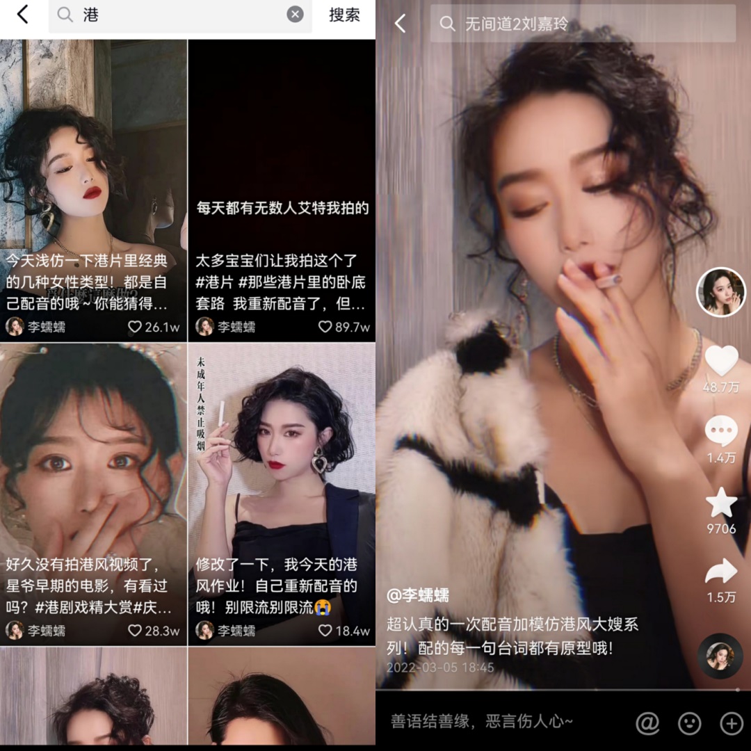在“港式甄選”出現(xiàn)以前,以“港風(fēng)”為特色的抖音博主并不少。抖音上有近1500萬粉絲的博主“李蠕蠕”就擅長模仿港劇片段,通過剪輯經(jīng)典劇集《愛在黑社會的日子》、《無間道》、《東邪西毒》里的臺詞,扮演關(guān)之琳、劉嘉玲等人飾演的經(jīng)典角色進(jìn)而開展帶貨。在小紅書上,搜索#港式#有超過48萬篇筆記,在抖音上,#港劇戲精大賞#播放次數(shù)也超過7600萬。