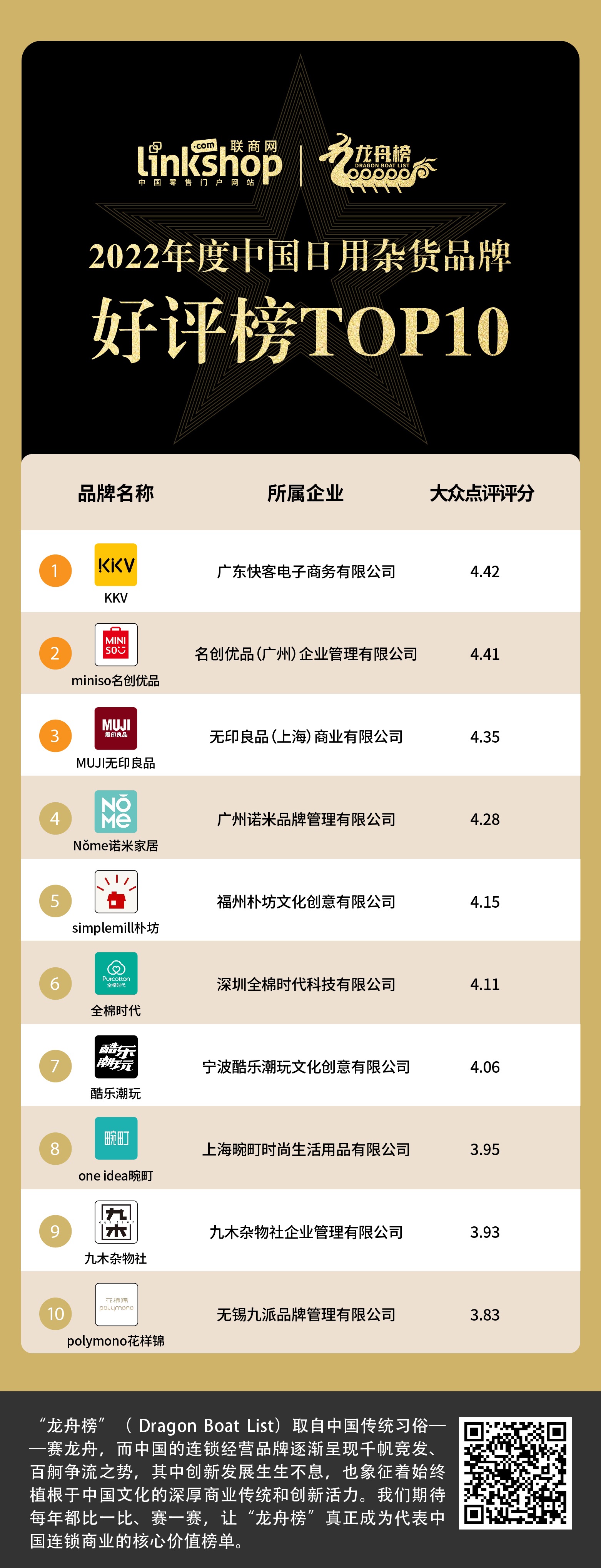 為此,《聯(lián)商網(wǎng)》根據(jù)大眾點評評分,推出了“2022年度日用雜貨連鎖品牌好評榜TOP10”榜單。