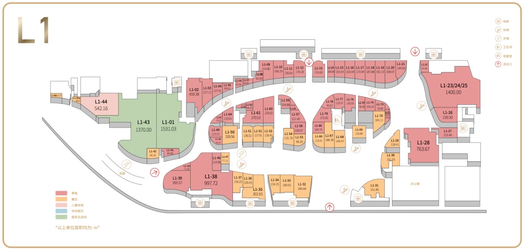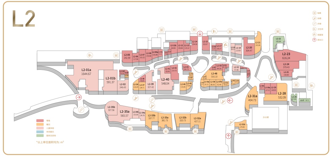 L2側重親子萌寵,設置了兒童區(qū)域,女性、生活方式、兒童零售區(qū),娛樂、寵物區(qū),美食主題區(qū),延長營業(yè)時間餐飲區(qū)。