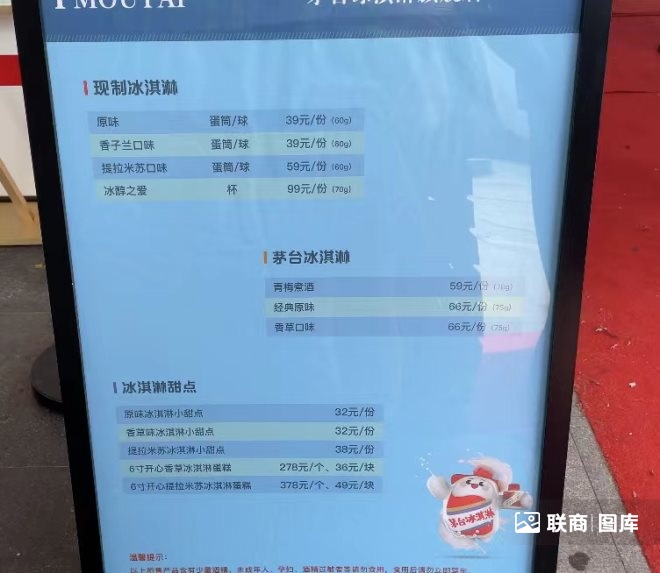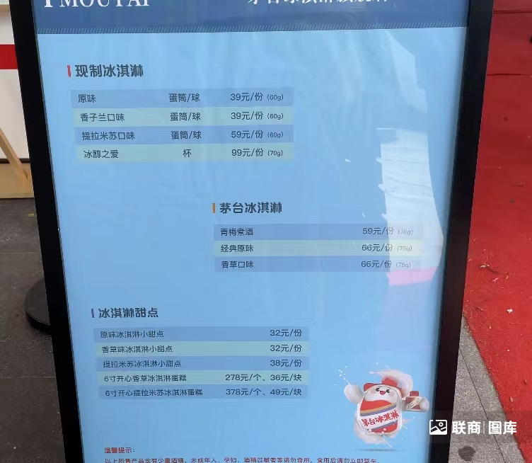 線下旗艦店售賣的除了預(yù)包裝款外,還有現(xiàn)制冰淇淋以及相關(guān)的冰淇淋甜點(diǎn),價(jià)格從39元至99元不等,據(jù)悉,店內(nèi)所售冰淇淋是按照每1kg牛奶摻入50g 53度飛天茅臺(tái)的比例制作!堵(lián)商網(wǎng)》巡店期間發(fā)現(xiàn),除了來“打卡”的年輕人,不乏中年人前來購買。