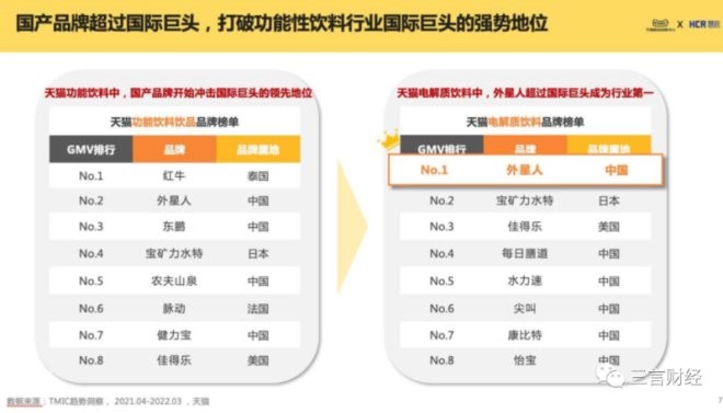 2021年,元氣森林又推出外星人電解質(zhì)水。今年4月,天貓發(fā)布了電解質(zhì)水報告。報告顯示,外星人已成為頭部品牌。位列天貓功能飲料飲品品牌榜單第二、天貓電解質(zhì)飲料榜單第一。從榜單上看,近一年外星人已經(jīng)超過老品牌日本寶礦力水特和美國佳得樂,直追深耕功能飲料市場數(shù)十年的紅牛。