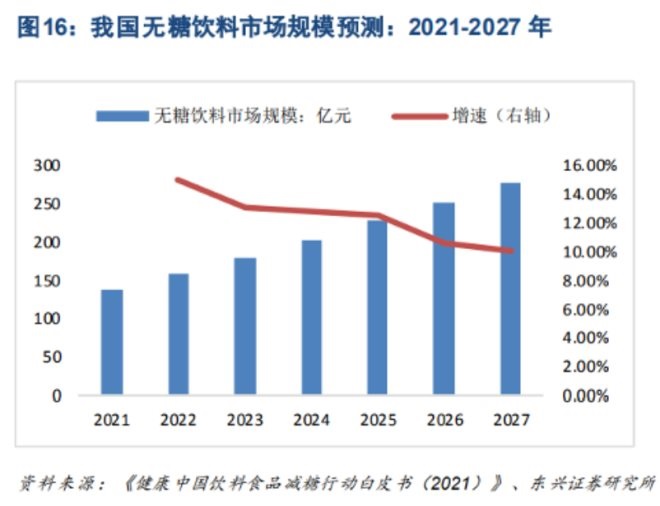 中國科學(xué)院發(fā)布的《2021中國無糖飲料市場趨勢洞察報告》指出:“隨著公眾健康意識的增強,無糖飲料的市場規(guī)模將進一步保持增長勢頭,預(yù)計未來5年內(nèi)實現(xiàn)翻番,2025年增至227.4億元規(guī)模!
