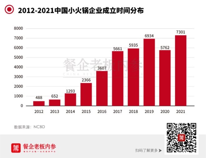 過(guò)去三年里,小火鍋市場(chǎng)正在快速成長(zhǎng),這股勢(shì)頭到2021年增速依然不減,僅去年新增的小火鍋門(mén)店數(shù)量就超過(guò)7300家,創(chuàng)近十年之最。據(jù)NCBD數(shù)據(jù)顯示,截至2021年12月底,中國(guó)的小火鍋企業(yè)數(shù)量達(dá)到4.16萬(wàn)家,在整體火鍋中的占比為5.7%,小火鍋已經(jīng)成長(zhǎng)為火鍋賽道中不可忽視的力量。